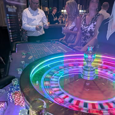 Unique Light-Up Wheels & Tables – Battery Operated and Hassle-Free: Our battery-operated gaming tables and roulette wheel are hassle-free, ensuring that no cords or plugs get in the way of your celebration. No need for PAT testing! The glowing lights create a dazzling, immersive atmosphere, bringing the Vegas experience right to your venue – without any of the usual complications. (These can be turned off due to health concerns, or set to one colour to match your wedding, party décor or charity colours)